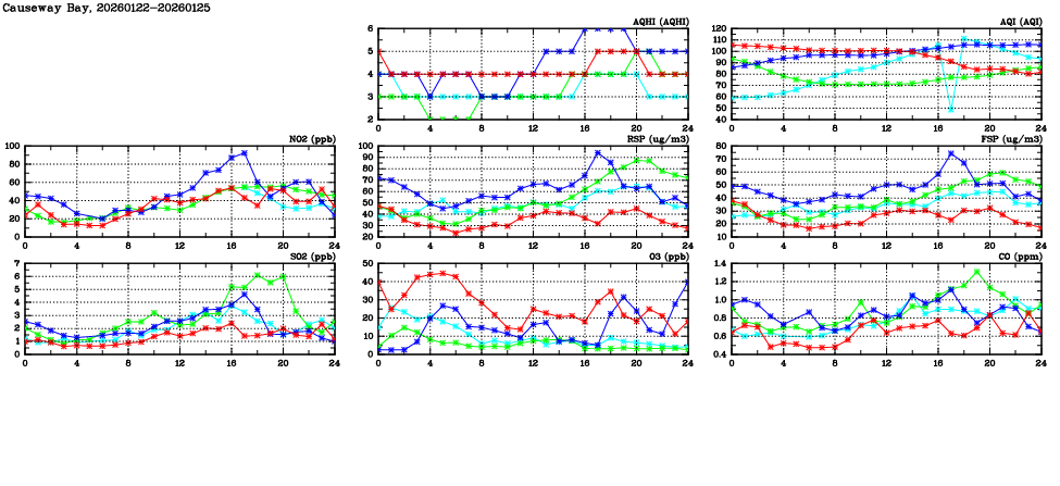 | Air Quality Data Time Series in Causeway Bay (2026/01/25) | ( Line colors: Day -3 Day -2 Day -1 Current day ) | 2D Map Current AQHI |