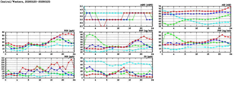 | Air Quality Data Time Series in Central/Western (2026/01/23) | ( Line colors: Day -3 Day -2 Day -1 Current day ) | 2D Map Current AQHI |