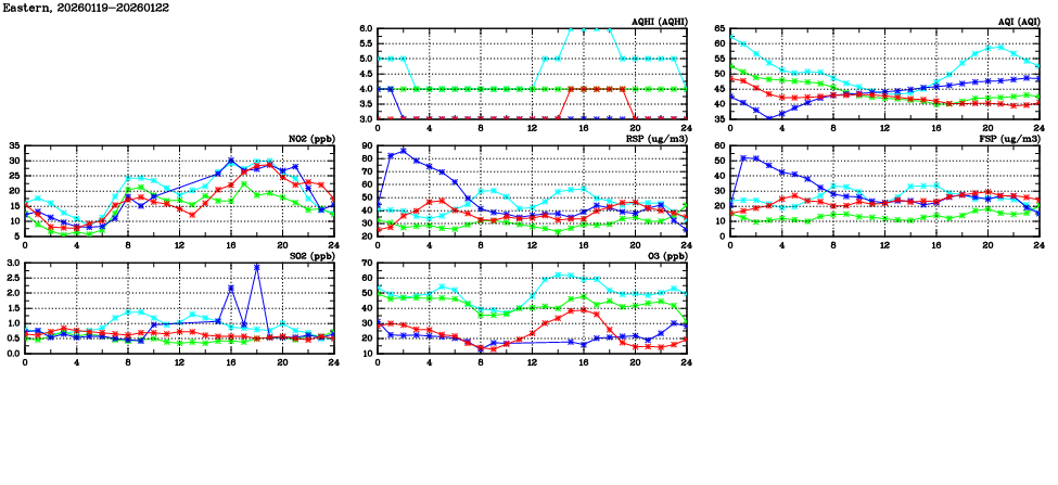 | Air Quality Data Time Series in Eastern (2026/01/22) | ( Line colors: Day -3 Day -2 Day -1 Current day ) | 2D Map Current AQHI |