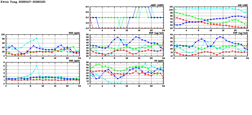 | Air Quality Data Time Series in Kwun Tong (2026/01/20) | ( Line colors: Day -3 Day -2 Day -1 Current day ) | 2D Map Current AQHI |