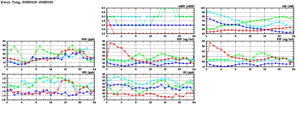 | Air Quality Data Time Series in Kwun Tong (2026/01/21) | ( Line colors: Day -3 Day -2 Day -1 Current day ) | 2D Map Current AQHI |