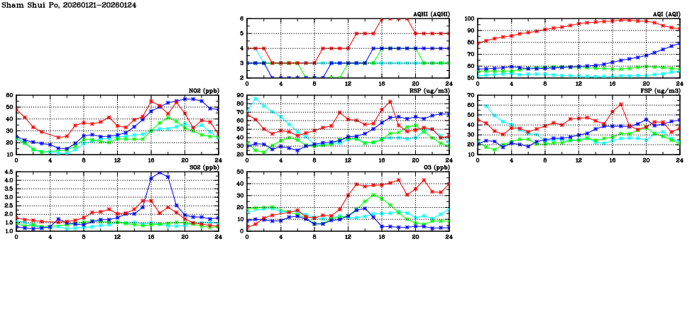 | Air Quality Data Time Series in Sham Shui Po (2026/01/24) | ( Line colors: Day -3 Day -2 Day -1 Current day ) | 2D Map Current AQHI |