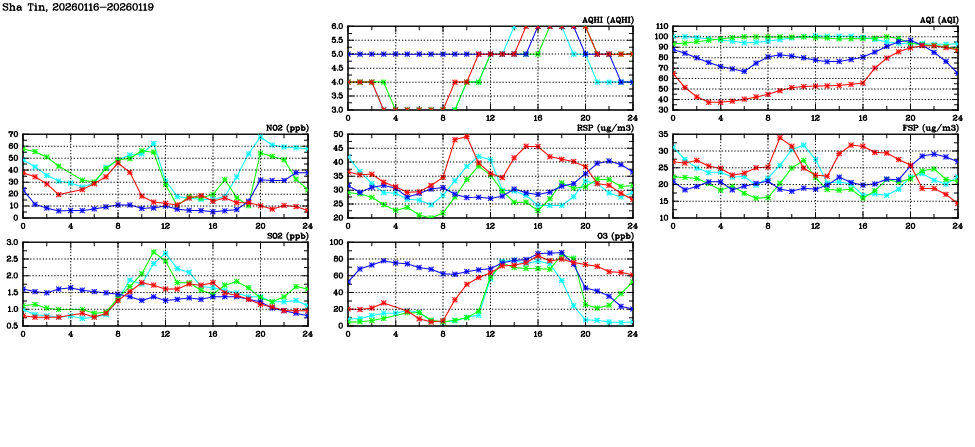 | Air Quality Data Time Series in Sha Tin (2026/01/19) | ( Line colors: Day -3 Day -2 Day -1 Current day ) | 2D Map Current AQHI |
