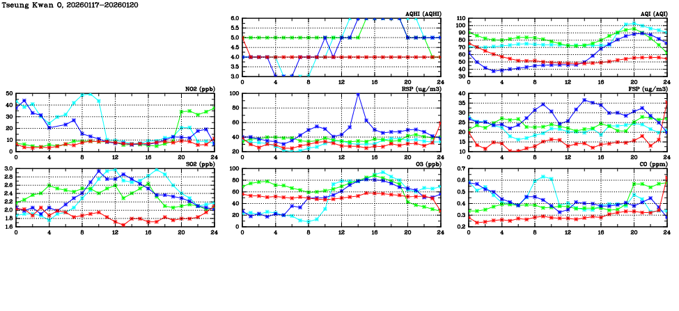 | Air Quality Data Time Series in Tseung Kwan O (2026/01/20) | ( Line colors: Day -3 Day -2 Day -1 Current day ) | 2D Map Current AQHI |