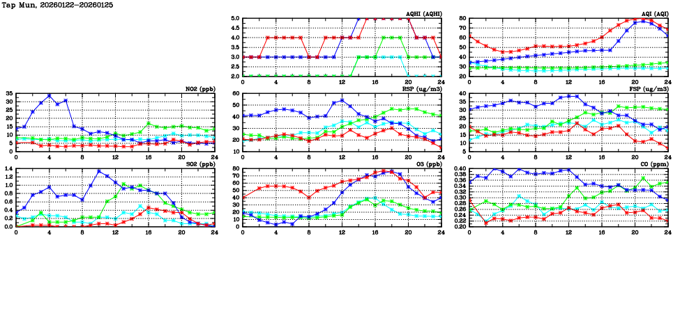 | Air Quality Data Time Series in Tap Mun (2026/01/25) | ( Line colors: Day -3 Day -2 Day -1 Current day ) | 2D Map Current AQHI |