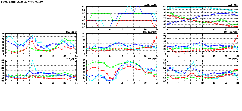 | Air Quality Data Time Series in Yuen Long (2026/01/20) | ( Line colors: Day -3 Day -2 Day -1 Current day ) | 2D Map Current AQHI |