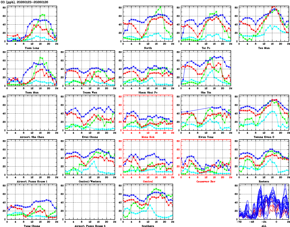 | Air Quality Data Time Series for O3 (2026/01/26) | ( Line colors: Day -3 Day -2 Day -1 Current day ) | 2D Map Current AQHI |