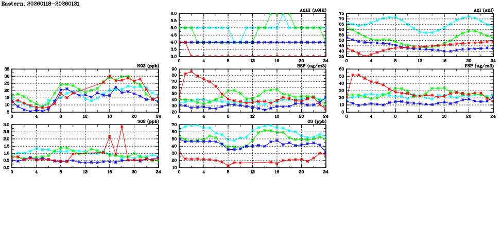 | Air Quality Data Time Series in Eastern (2026/01/21) | ( Line colors: Day -3 Day -2 Day -1 Current day ) | 2D Map Current AQHI |