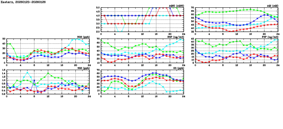 | Air Quality Data Time Series in Eastern (2026/01/26) | ( Line colors: Day -3 Day -2 Day -1 Current day ) | 2D Map Current AQHI |