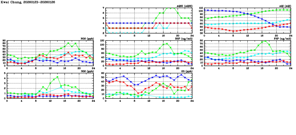 | Air Quality Data Time Series in Kwai Chung (2026/01/26) | ( Line colors: Day -3 Day -2 Day -1 Current day ) | 2D Map Current AQHI |