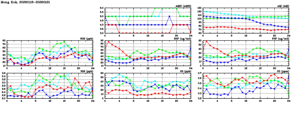 | Air Quality Data Time Series in Mong Kok (2026/01/21) | ( Line colors: Day -3 Day -2 Day -1 Current day ) | 2D Map Current AQHI |