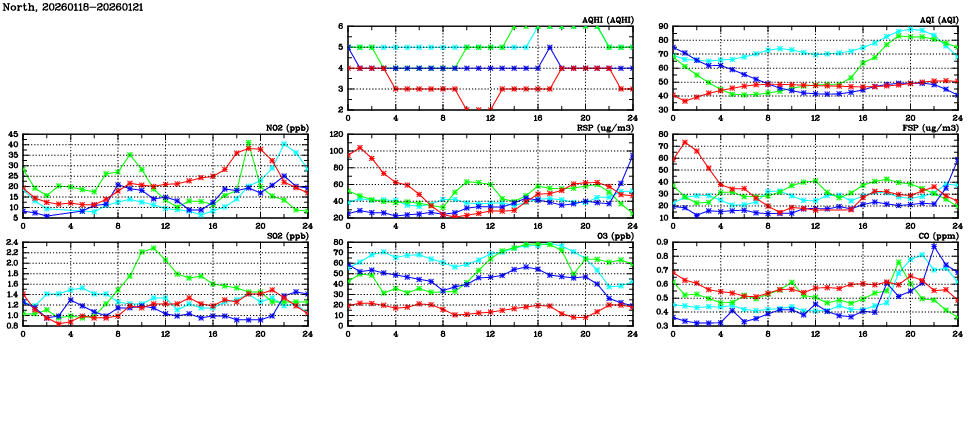 | Air Quality Data Time Series in North (2026/01/21) | ( Line colors: Day -3 Day -2 Day -1 Current day ) | 2D Map Current AQHI |
