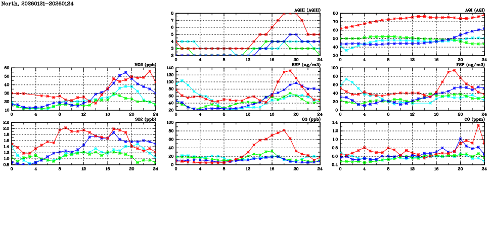 | Air Quality Data Time Series in North (2026/01/24) | ( Line colors: Day -3 Day -2 Day -1 Current day ) | 2D Map Current AQHI |