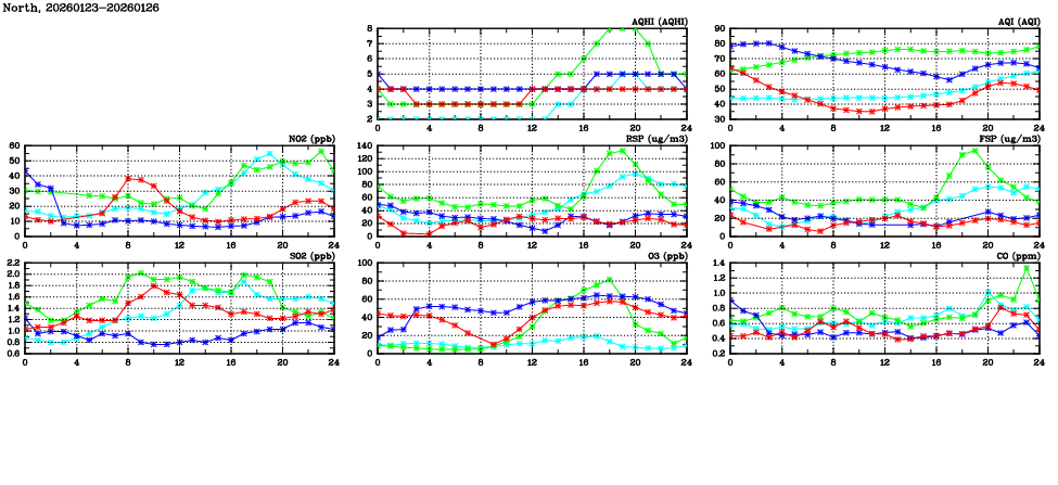 | Air Quality Data Time Series in North (2026/01/26) | ( Line colors: Day -3 Day -2 Day -1 Current day ) | 2D Map Current AQHI |