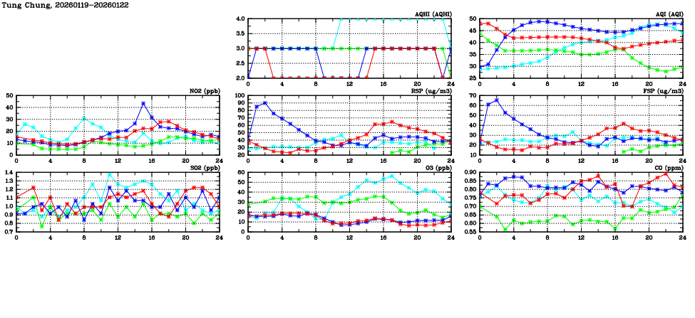 | Air Quality Data Time Series in Tung Chung (2026/01/22) | ( Line colors: Day -3 Day -2 Day -1 Current day ) | 2D Map Current AQHI |