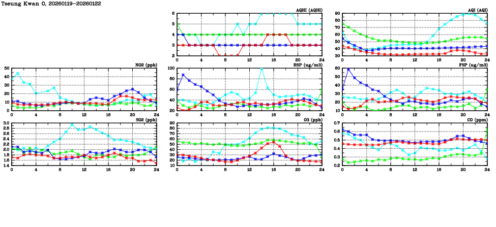 | Air Quality Data Time Series in Tseung Kwan O (2026/01/22) | ( Line colors: Day -3 Day -2 Day -1 Current day ) | 2D Map Current AQHI |