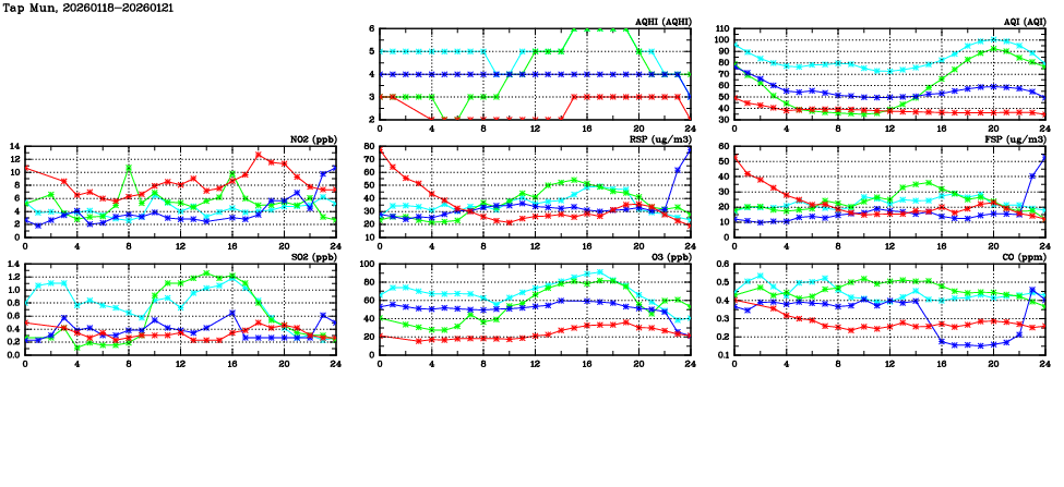 | Air Quality Data Time Series in Tap Mun (2026/01/21) | ( Line colors: Day -3 Day -2 Day -1 Current day ) | 2D Map Current AQHI |