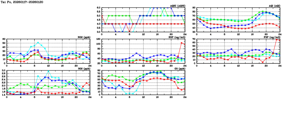 | Air Quality Data Time Series in Tai Po (2026/01/20) | ( Line colors: Day -3 Day -2 Day -1 Current day ) | 2D Map Current AQHI |