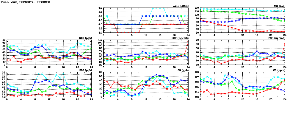| Air Quality Data Time Series in Tuen Mun (2026/01/20) | ( Line colors: Day -3 Day -2 Day -1 Current day ) | 2D Map Current AQHI |