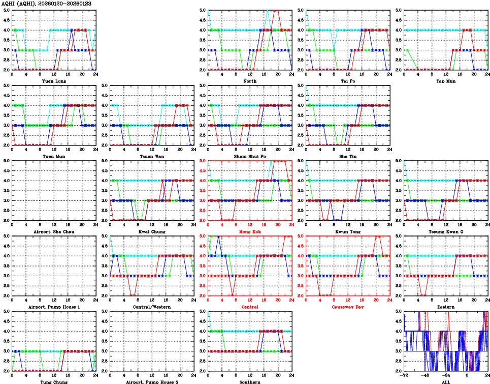 | Air Quality Data Time Series for AQHI (2026/01/23) | ( Line colors: Day -3 Day -2 Day -1 Current day ) | 2D Map Current AQHI |