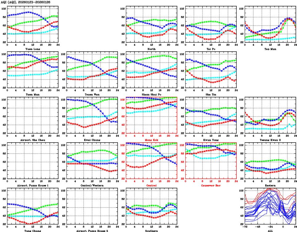 | Air Quality Data Time Series for AQI (2026/01/26) | ( Line colors: Day -3 Day -2 Day -1 Current day ) | 2D Map Current AQHI |