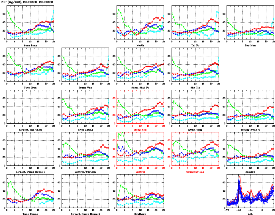 | Air Quality Data Time Series for FSP (2026/01/23) | ( Line colors: Day -3 Day -2 Day -1 Current day ) | 2D Map Current AQHI |