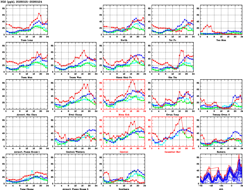 | Air Quality Data Time Series for NO2 (2026/01/24) | ( Line colors: Day -3 Day -2 Day -1 Current day ) | 2D Map Current AQHI |