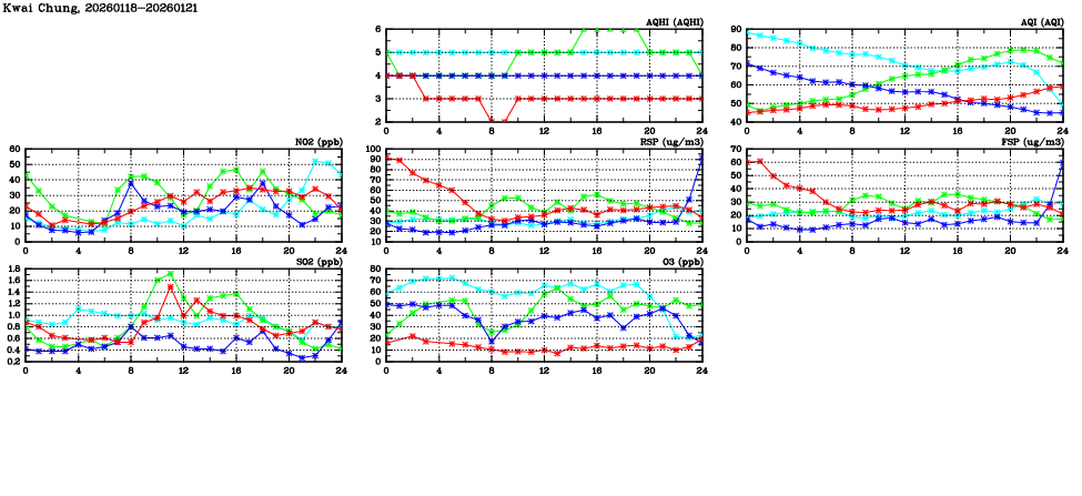 | Air Quality Data Time Series in Kwai Chung (2026/01/21) | ( Line colors: Day -3 Day -2 Day -1 Current day ) | 2D Map Current AQHI |