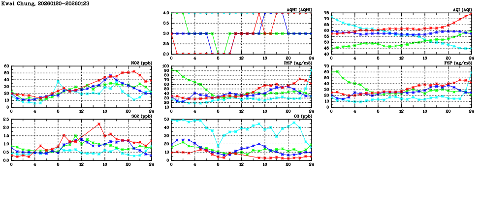 | Air Quality Data Time Series in Kwai Chung (2026/01/23) | ( Line colors: Day -3 Day -2 Day -1 Current day ) | 2D Map Current AQHI |