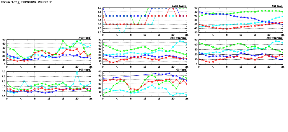 | Air Quality Data Time Series in Kwun Tong (2026/01/26) | ( Line colors: Day -3 Day -2 Day -1 Current day ) | 2D Map Current AQHI |
