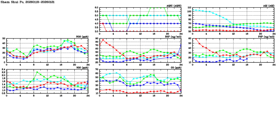 | Air Quality Data Time Series in Sham Shui Po (2026/01/21) | ( Line colors: Day -3 Day -2 Day -1 Current day ) | 2D Map Current AQHI |
