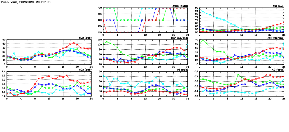 | Air Quality Data Time Series in Tuen Mun (2026/01/23) | ( Line colors: Day -3 Day -2 Day -1 Current day ) | 2D Map Current AQHI |