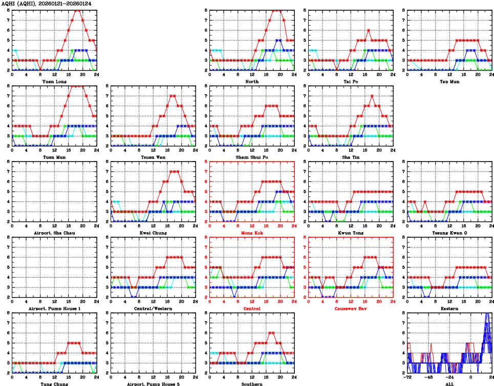 | Air Quality Data Time Series for AQHI (2026/01/24) | ( Line colors: Day -3 Day -2 Day -1 Current day ) | 2D Map Current AQHI |