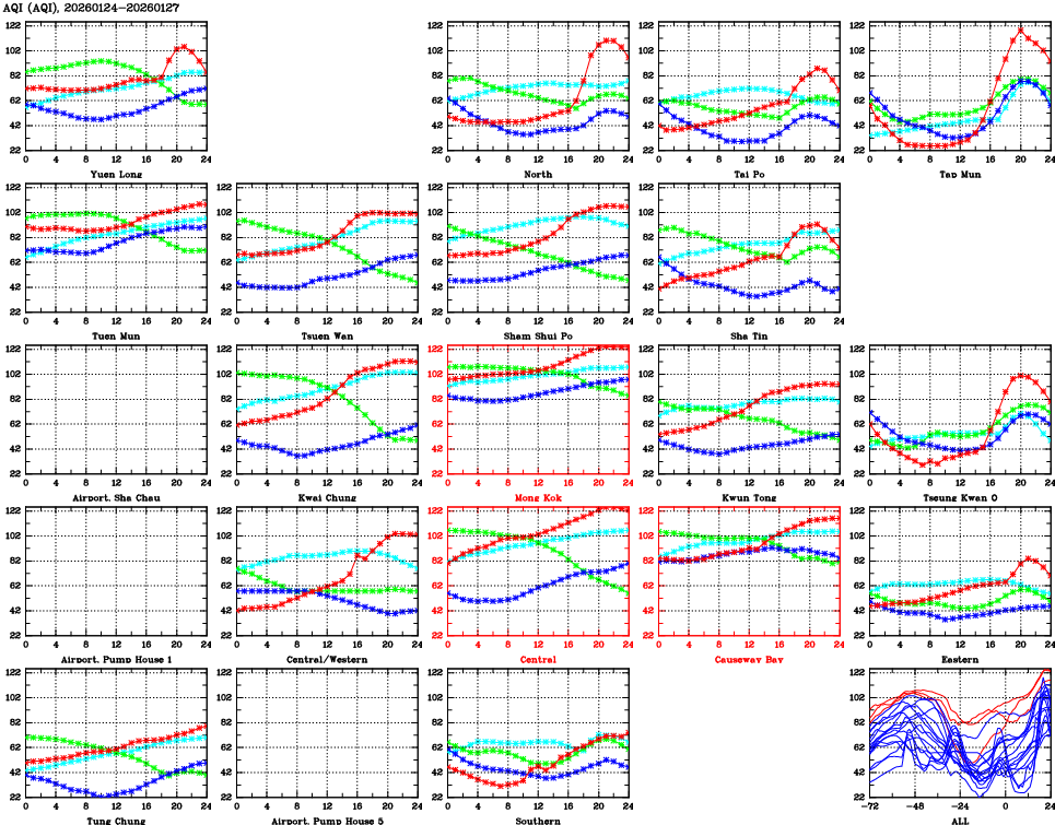 | Air Quality Data Time Series for AQI (2026/01/27) | ( Line colors: Day -3 Day -2 Day -1 Current day ) | 2D Map Current AQHI |