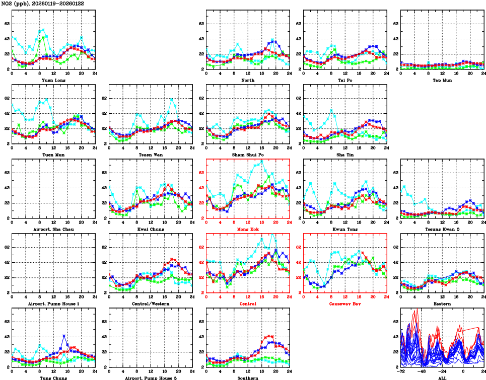 | Air Quality Data Time Series for NO2 (2026/01/22) | ( Line colors: Day -3 Day -2 Day -1 Current day ) | 2D Map Current AQHI |