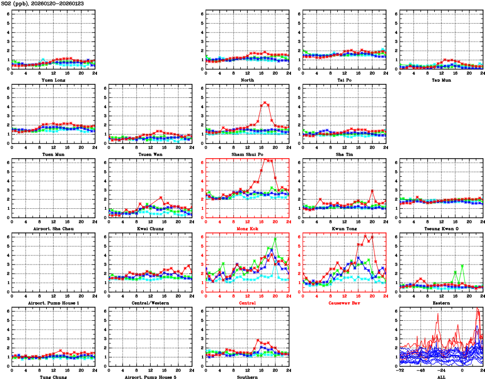 | Air Quality Data Time Series for SO2 (2026/01/23) | ( Line colors: Day -3 Day -2 Day -1 Current day ) | 2D Map Current AQHI |
