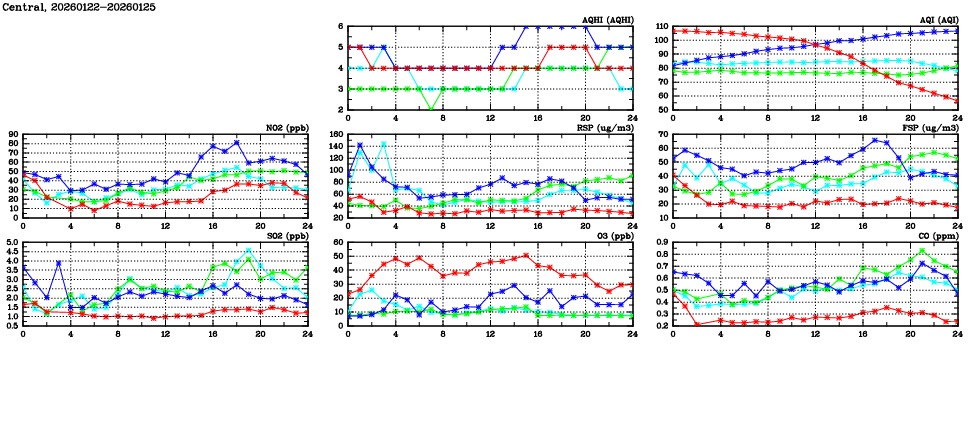 | Air Quality Data Time Series in Central (2026/01/25) | ( Line colors: Day -3 Day -2 Day -1 Current day ) | 2D Map Current AQHI |