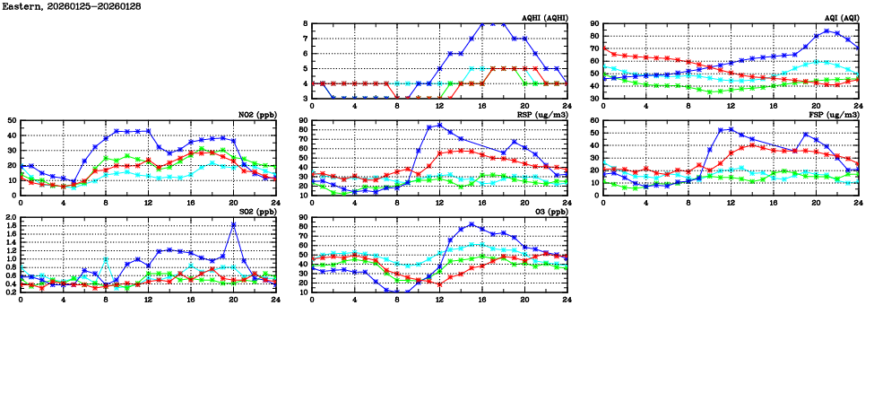 | Air Quality Data Time Series in Eastern (2026/01/28) | ( Line colors: Day -3 Day -2 Day -1 Current day ) | 2D Map Current AQHI |