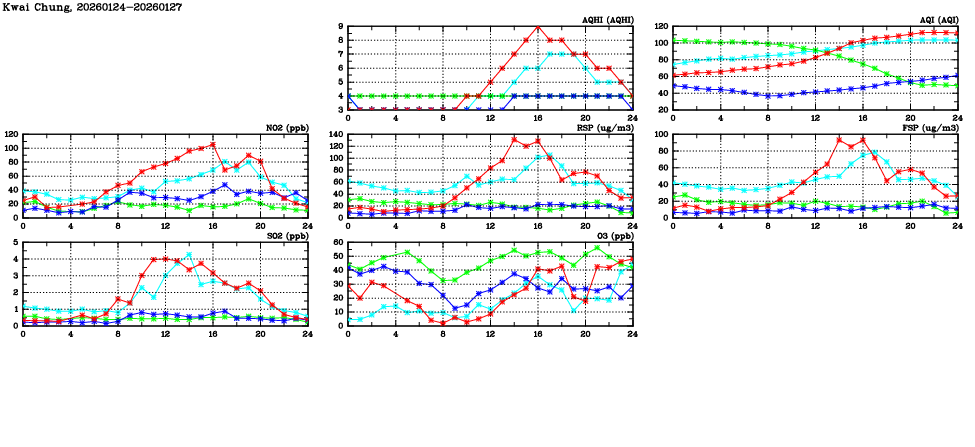 | Air Quality Data Time Series in Kwai Chung (2026/01/27) | ( Line colors: Day -3 Day -2 Day -1 Current day ) | 2D Map Current AQHI |