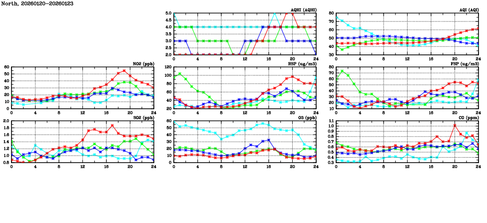 | Air Quality Data Time Series in North (2026/01/23) | ( Line colors: Day -3 Day -2 Day -1 Current day ) | 2D Map Current AQHI |