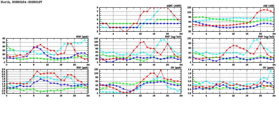| Air Quality Data Time Series in North (2026/01/27) | ( Line colors: Day -3 Day -2 Day -1 Current day ) | 2D Map Current AQHI |