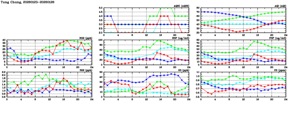 | Air Quality Data Time Series in Tung Chung (2026/01/26) | ( Line colors: Day -3 Day -2 Day -1 Current day ) | 2D Map Current AQHI |