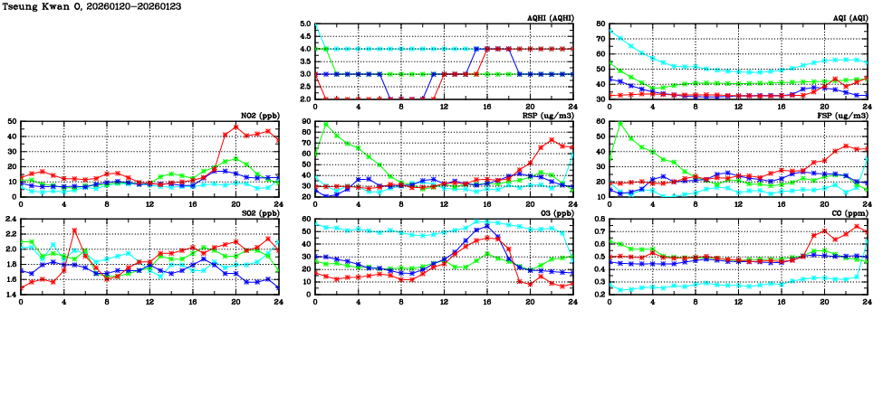 | Air Quality Data Time Series in Tseung Kwan O (2026/01/23) | ( Line colors: Day -3 Day -2 Day -1 Current day ) | 2D Map Current AQHI |