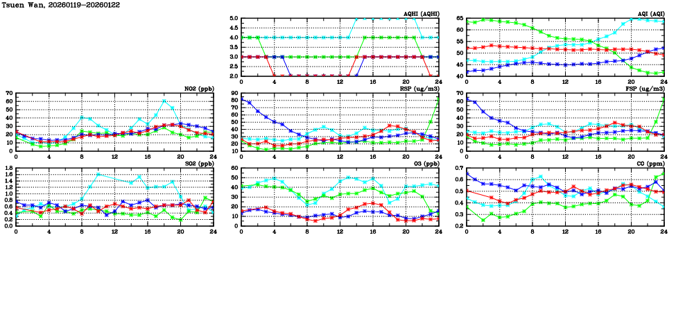 | Air Quality Data Time Series in Tsuen Wan (2026/01/22) | ( Line colors: Day -3 Day -2 Day -1 Current day ) | 2D Map Current AQHI |