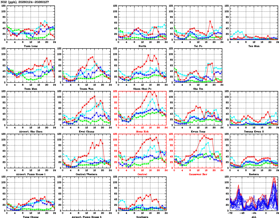 | Air Quality Data Time Series for NO2 (2026/01/27) | ( Line colors: Day -3 Day -2 Day -1 Current day ) | 2D Map Current AQHI |