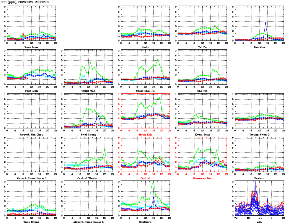 | Air Quality Data Time Series for SO2 (2026/01/29) | ( Line colors: Day -3 Day -2 Day -1 Current day ) | 2D Map Current AQHI |