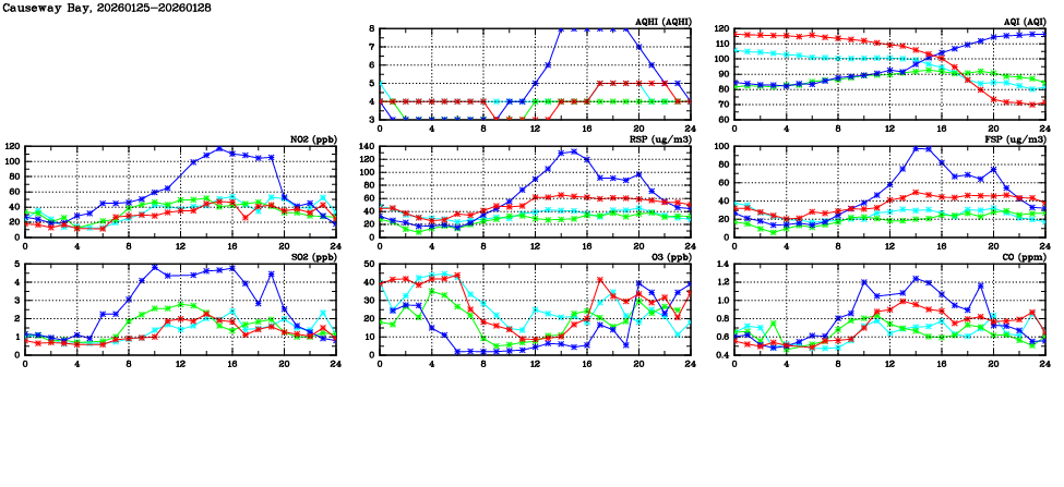 | Air Quality Data Time Series in Causeway Bay (2026/01/28) | ( Line colors: Day -3 Day -2 Day -1 Current day ) | 2D Map Current AQHI |