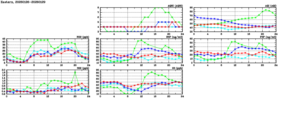 | Air Quality Data Time Series in Eastern (2026/01/29) | ( Line colors: Day -3 Day -2 Day -1 Current day ) | 2D Map Current AQHI |