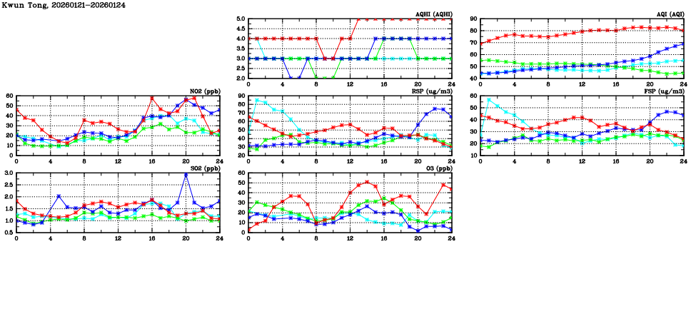 | Air Quality Data Time Series in Kwun Tong (2026/01/24) | ( Line colors: Day -3 Day -2 Day -1 Current day ) | 2D Map Current AQHI |