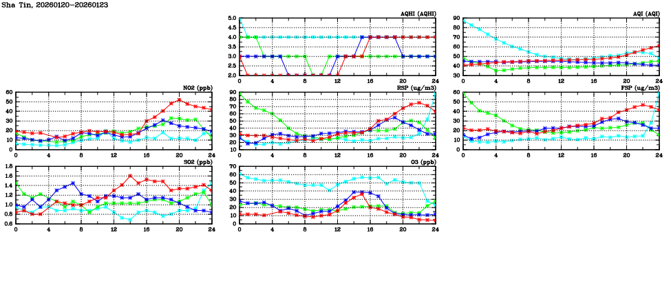 | Air Quality Data Time Series in Sha Tin (2026/01/23) | ( Line colors: Day -3 Day -2 Day -1 Current day ) | 2D Map Current AQHI |